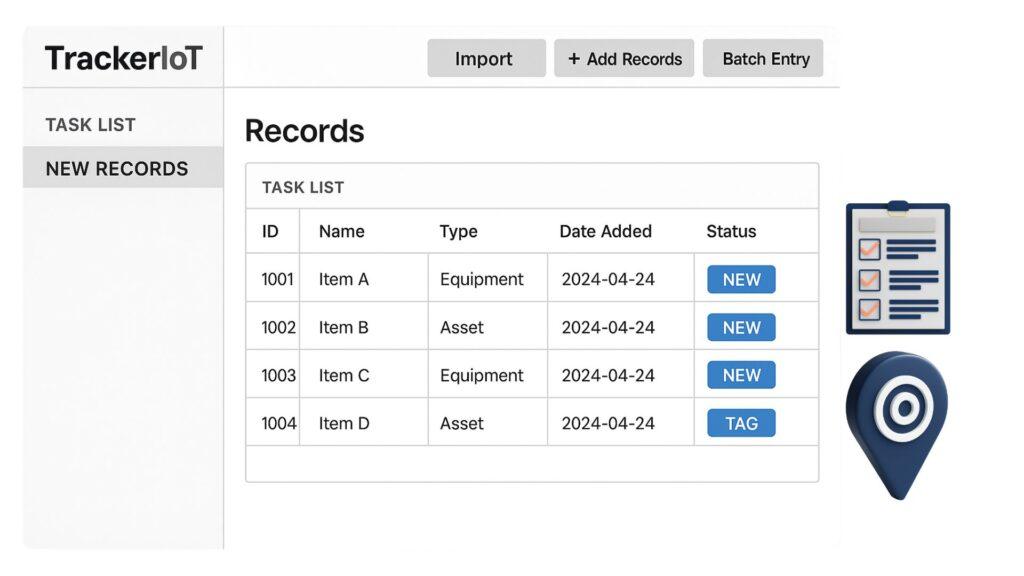 - New records are added to a ‘New Records’ task list that enables Users to confirm data, tag items and add to the TrackerIoT database.